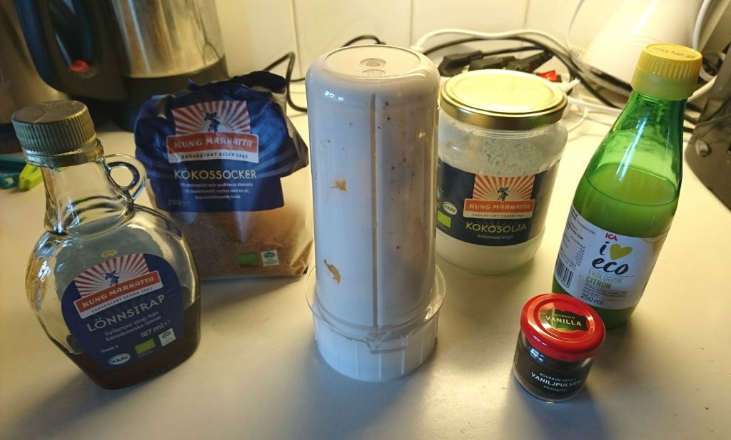 I receptet kan man köra på enbart lönnsirap men det är så jäkla dyrt och det behövs ganska mycket, så jag föredrar att blanda med kokossocker. Jag använder inga mått när jag gör detta utan jag smakar bara av. Det kommer skilja mycket i receptet beroende på vilken sirap och vilken sorts socker du använder, och om du använder färskpressad citron eller citron på flaska, så känn av lite själv. Men jag skulle iallafall säga att det behövs ganska mycket mer citron och sötma än man tror, så smaka av för den ska smaka fräscht.