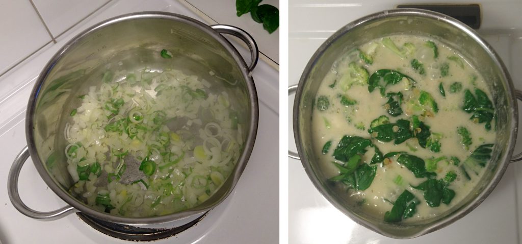 Börja med att hacka gul lök & purjolök och fräs med lite olivolja i en stor kastrull. När det fräst ett par minuter, häll i 2 burkar kokosmjölk, när det börjat koka upp – häll i 1dl avsköljda röda linser. Låt koka 5 minuter och hacka under tiden pak choi och broccoli i mindre bitar. Häll sedan i pak choi, broccoli och spenat i grytan och låt koka i ett par minuter medan du smaksätter med lite grönsaksbuljong, chili och 4 pressade vitlöksklyftor, salt&peppar och ev. lite citronsaft. Sedan är det bara att servera!